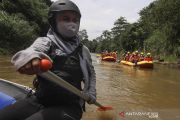 Peserta mendayung perahu karet mengamati titik longsor di Ruas Sungai Ciliwung, Depok, Jawa Barat, Jumat (23/10/2020). Kegiatan tersebut sebagai pelatihan penanggulangan bencana longsor dan banjir di ruas Sungai Ciliwung. ANTARA FOTO/Asprilla Dwi Adha/pras.