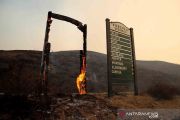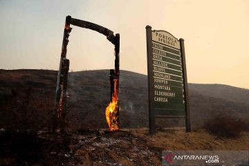 Sebuah papan informasi terbakar saat Api Silverado mendekati permukiman warga di dekat Irvine, California, Amerika Serikat, Senin (26/10/2020). ANTARA FOTO/REUTERS/ Mike Blake/wsj.
