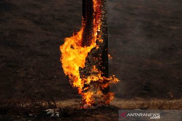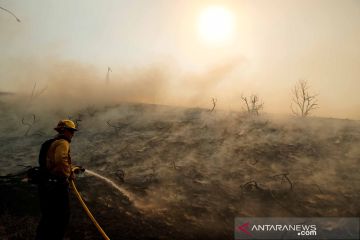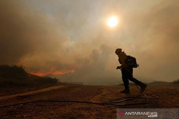 Seorang personel pemadam kebakaran berusaha memadamkan Api Silverado yang mendekati permukiman warga di dekat Irvine, California, Amerika Serikat, Senin (26/10/2020). ANTARA FOTO/REUTERS/ Mike Blake/wsj.