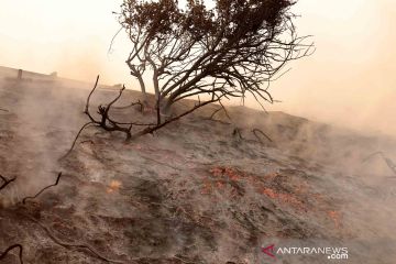Asap membubung saat Api Silverado mendekati permukiman warga di dekat Irvine, California, Amerika Serikat, Senin (26/10/2020). ANTARA FOTO/REUTERS/ Mike Blake/wsj.