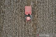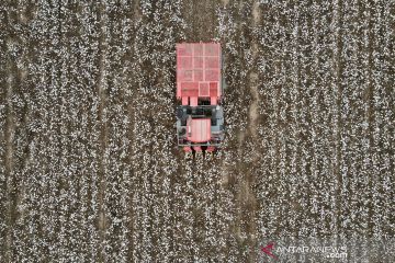 Foto dari udara mesin pemetik kapas beroperasi di sebuah ladang di Wangdaozhai, Kota Nangong, Provinsi Hebei, China utara, Selasa (27/10/2020). ANTARA FOTO/Xinhua/Mu Yu/pras.