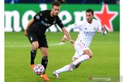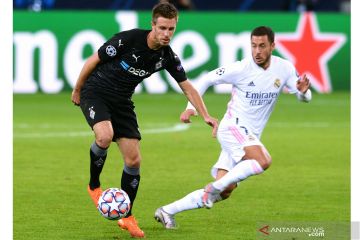Pesepak bola Borussia Moenchengladbach Patrick Herrmann (kiri) berebut bola dengan pesepak bola Real Madrid Eden Hazard (kanan) dalam laga Group B Liga Champions, di Stadion Borussia-Park, Moenchengladbach, Jerman, Selasa (27/10/2020). Borussia Moenchengladbach dan Madrid berbagi angka 2-2. ANTARA FOTO/Reuters-Uwe Kraft/hp.