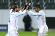 Pesepak bola Real Madrid Casemiro (kanan) melakukan selebrasi bersama rekannya Sergio Ramos setelah berhasil mencetak gol ke gawang Borussia Moenchengladbach dalam laga Group B Liga Champions, di Stadion Borussia-Park, Moenchengladbach, Jerman, Selasa (27/10/2020). Borussia Moenchengladbach dan Madrid berbagi angka 2-2. ANTARA FOTO/Reuters-Uwe Kraft/hp.