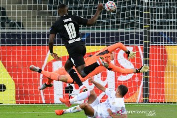 Pesepak bola Borussia Moenchengladbach Marcus Thuram (kiri) mencetak gol ke gawang Real Madrid yang di jaga penjaga gawang Thibaut Courtois dalam laga Group B Liga Champions, di Stadion Borussia-Park, Moenchengladbach, Jerman, Selasa (27/10/2020). Borussia Moenchengladbach dan Madrid berbagi angka 2-2. ANTARA FOTO/Reuters-Uwe Kraft/hp.