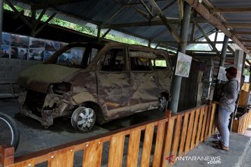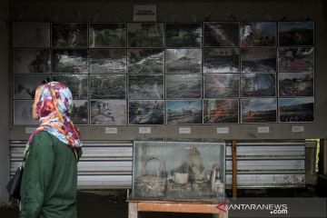 Pengunjung mengamati koleksi yang dipamerkan di Petilasan Rumah Mbah Maridjan, Kinahrejo, Palemsari, Cangkringan, Sleman, D.I Yogyakarta, Rabu (28/10/2020). Petilasan yang menjadi saksi erupsi Gunung Merapi tahun 2010 itu merupakan salah satu destinasi wisata alternatif di Yogyakarta. ANTARA FOTO/Andreas Fitri Atmoko/hp.