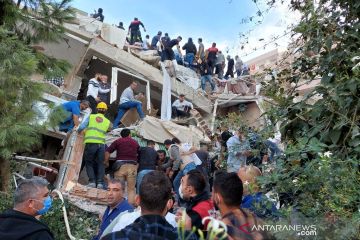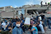 Sebuah bangunan di provinsi pesisir Izmir runtuh akibat gempa yang mengguncang Laut Aegea, Turki, Jumat (30/10/2020). Enam orang tewas dan 202 orang terluka akibat gempa berkekuatan magnitudo 7.0 itu. ANTARA FOTO/REUTERS/Tuncay Dersinlioglu/pras.