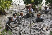Warga menanam bibit tanaman Mangrove di pantai, di kawasan Greges, Surabaya, Jawa Timur, Sabtu (31/10/2020). Kegiatan bersih-bersih sampah plastik serta menanam bibit tanaman Mangrove yang dilakukan Jaga Segara bersama sejumlah mahasiswa dan warga setempat tersebut wujud kepedulian terhadap lingkungan di kawasan pantai. ANTARA FOTO/Didik Suhartono/hp.