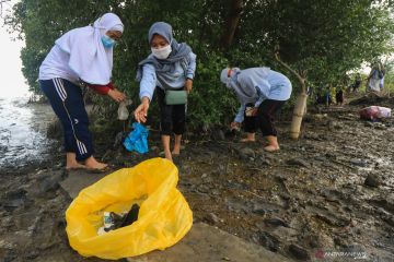 Warga memunguti sampah plastik yang berserakan di pantai, di kawasan Greges, Surabaya, Jawa Timur, Sabtu (31/10/2020). Kegiatan bersih-bersih sampah plastik serta menanam bibit tanaman Mangrove yang dilakukan Jaga Segara bersama sejumlah mahasiswa dan warga setempat tersebut wujud kepedulian terhadap lingkungan di kawasan pantai. ANTARA FOTO/Didik Suhartono/hp.