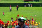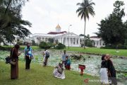 Sejumlah pengunjung berfoto dengan latar belakang Istana Kepresidenan di kawasan Kebun Raya Bogor, Jawa Barat, Minggu (1/11/2020). Kebun Raya Bogor yang diusulkan menjadi salah satu warisan budaya dunia tersebut menjadi tempat wisata favorit bagi warga dalam mengisi libur panjang akhir pekan di tengah pandemi COVID-19. ANTARA FOTO/Arif Firmansyah/aww.