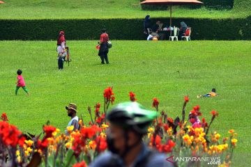 Sejumlah pengunjung berwisata di kawasan Kebun Raya Bogor, Jawa Barat, Minggu (1/11/2020). Kebun Raya Bogor yang diusulkan menjadi salah satu warisan budaya dunia tersebut menjadi tempat wisata favorit bagi warga dalam mengisi libur panjang akhir pekan di tengah pandemi COVID-19. ANTARA FOTO/Arif Firmansyah/aww.