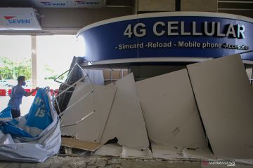 Petugas membersihkan puing fasilitas yang rusak di Terminal 3 Bandara Soekarno Hatta, Tangerang, Banten, Selasa (10/11/2020). Pasca penyambutan kedatangan Habib Rizieq Shihab (HRS), sejumlah fasilitas mengalami kerusakan akibat massa yang berdesakan di kawasan tersebut. ANTARA FOTO/Fauzan/foc.