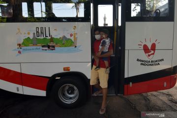 Warga turun dari bus seusai berkeliling kota dalam uji coba bus listrik di Denpasar, Bali, Kamis (12/11/2020). Uji coba bus listrik yang digelar pada 8 November hingga 8 Desember 2020 secara gratis tersebut untuk diperkenalkan kepada masyarakat sekaligus sebagai upaya mengurangi polusi di pulau dewata. ANTARA FOTO/Nyoman Hendra Wibowo/hp.