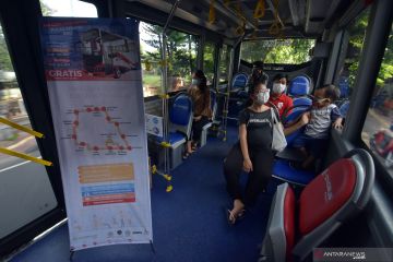 Sejumlah warga menumpangi bus listrik saat uji coba di Denpasar, Bali, Kamis (12/11/2020). Uji coba bus listrik yang digelar pada 8 November hingga 8 Desember 2020 secara gratis tersebut untuk diperkenalkan kepada masyarakat sekaligus sebagai upaya mengurangi polusi di pulau dewata. ANTARA FOTO/Nyoman Hendra Wibowo/hp.