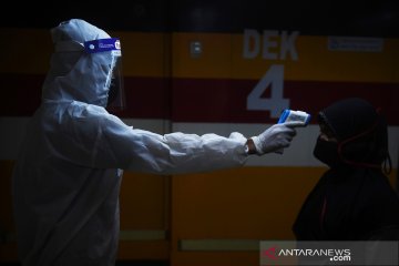 Petugas memeriksa suhu penumpang yang akan menaiki KM Dorolonda sebelum diberangkatkan dari Terminal Penumpang Tanjung Priok, Jakarta, Minggu (15/11/2020). PT Pelni menerapkan protokol kesehatan yang ketat dan sudah diverifikasi oleh Komite Nasional Keselamatan Transportasi (KNKT) guna memastikan penumpang angkutan laut terhindar dari COVID-19. ANTARA FOTO/Akbar Nugroho Gumay/aww.
