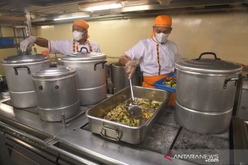 Koki mengenakan masker saat memasak makanan di KM Dorolonda yang akan diberangkatkan dari Terminal Penumpang Tanjung Priok, Jakarta, Minggu (15/11/2020). PT Pelni menerapkan protokol kesehatan yang ketat dan sudah diverifikasi oleh Komite Nasional Keselamatan Transportasi (KNKT) guna memastikan penumpang angkutan laut terhindar dari COVID-19. ANTARA FOTO/Akbar Nugroho Gumay/aww.