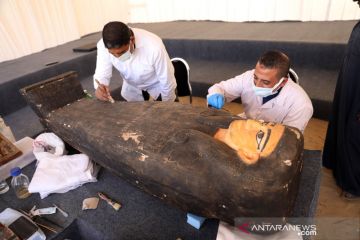 Sebuah artefak yang baru ditemukan terlihat di situs penemuan peti mati kayu berwarna-warni di Provinsi Giza, Mesir, Sabtu (14/11/2020). Kementerian Pariwisata dan Kepurbakalaan Mesir pada Sabtu (14/11) memamerkan 100 peti mati kuno yang baru ditemukan di Provinsi Giza dekat ibu kota Kairo. ANTARA FOTO/Xinhua/Ahmed Gomaa/pras.