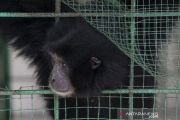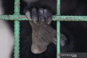 Seekor Siamang Sumatera (Symphalangus syndactylus) berada di kandang transit Balai Konservasi Sumber Daya Alam (BKSDA) Provinsi Sumatera Selatan Resort Punti Kayu Palembang, Sumatera Selatan, Senin (16/11/2020). BKSDA Provinsi Sumatera Selatan akan melepaskan liarkan enam ekor siamang Sumatera hasil serahan masyarakat ke habitat asalnya di Kabupaten Lahat, Sumatera Selatan. ANTARA FOTO/Nova Wahyudi/pras.