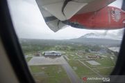 Bandara Raden Sadjad tampak dari pesawat komersial Wings Air tujuan Batam yang terbang di Ranai, Kabupaten Natuna, Kepulauan Riau, Selasa (17/11/2020). Selama masa pandemi COVID-19 hanya ada dua maskapai penerbangan yang melayani penumpang di bandara tersebut, antara lain Wings Air dengan jadwal sekali dalam sehari pada Senin hingga Sabtu dan Sriwijaya Air sekali dalam seminggu setiap Senin, dengan rute dari dan ke Bandara Hang Nadim Batam, Kepri. ANTARA FOTO/Aditya Pradana Putra/pras.