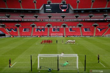 Pesepak bola Arsenal Pierre-Emerick Aubameyang mencetak gol dari titik penalti saat melawan LIverpool dalam laga Community Shield Piala FA dimana pertandingan tersebut dilakukan tanpa kehadiran penonton karena masih mewabahnya virus Corona (COVID-19), di Stadion Wembley, London, Britain, 29 August 2020. Arsenal keluar sebagai pemenang lewat adu penalti setelah kedudukan sama kuat 1-1 dalam waktu normal. ANTARA FOTO/Arsip Foto Reuters-Andrew Couldridge/hp.