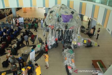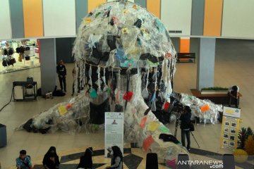 Sejumlah pengunjung melintas di dekat replika ubur-ubur yang terbuat dari sampah plastik di Mall Mamuju, Sulawesi Barat, Jumat (20/11/2020). Festival sampah laut mengangkat tema âPandemic Underwater Festival 2020â bertujuan untuk mengkampanyekan permasalahan sampah di laut yang dapat merusak ekosistem laut. ANTARA FOTO/ Akbar Tado/aww.