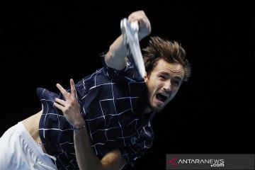 Petenis Daniil Medvedev asal Rusia berteriak mengembalikan bola ke arah lawannya petenis Rafael Nadal asal Spanyol pada pertandingan semifinals kejuaraan ATP Finals di Arena O2, London, Inggris, Minggu (22/11/2020) dini hari. Rafael Nadal gagal melaju ke babak final usai kalah dari Daniil Medvedev dalam tiga set 3-6, 7-6, 6-3. ANTARA FOTO/REUTERS/Toby Melville/wsj.