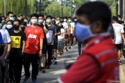 Sejumlah warga antre untuk berolahraga di bagian luar Stadion Utama, Kompleks Gelora Bung Karno (GBK), Jakarta, Minggu (22/11/2020). Pengelola GBK tetap membuka kesempatan warga untuk berolahraga di saat Pembatasan Sosial Berskala Besar (PSBB) Transisi di Ibu Kota dengan menerapkan protokol kesehatan dan pembatasan waktu kunjungan. ANTARA FOTO/M Risyal Hidayat/wsj.