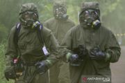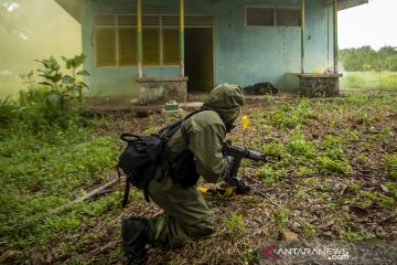 Prajurit TNI AD dari satuan Zeni Demosili memeriksa lokasi ledakan gas beracun saat Latihan Antar Kecabangan TNI AD Kartika Yudha Tahun 2020 di Desa Sepancar, Lawan Kulon, Baturaja Timur, Ogan Komering Ulu (OKU), Sumatera Selatan, Senin (23/11/2020). ANTARA FOTO/Nova Wahyudi/pras.