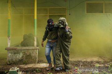 Prajurit TNI AD dari satuan Zeni Demosili berusaha mengevakuasi warga yang menjadi korban ledakan gas beracun saat Latihan Antar Kecabangan TNI AD Kartika Yudha Tahun 2020 di Desa Sepancar, Lawan Kulon, Baturaja Timur, Ogan Komering Ulu (OKU), Sumatera Selatan, Senin (23/11/2020). ANTARA FOTO/Nova Wahyudi/pras.
