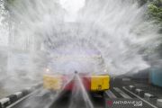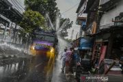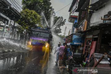 Kendaraan meriam air (water canon) menyemprotkan cairan disinfektan di kawasan Tebet, Jakarta, Senin (23/11/2020). Polda Metro Jaya menyelenggarakan bakti sosial penyemprotan cairan disinfektan dan tes cepat atau rapid test COVID-19 karena adanya temuan kasus terkonfirmasi positif COVID-19 dari jamaah Maulid Nabi Muhammad SAW yang diselenggarakan di kawasan Tebet. ANTARA FOTO/Galih Pradipta/pras.