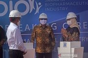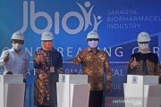 Kepala Staf Kepresidenan Moeldoko (tengah) didampingi Kepala Balai Pengawasan Obat dan Makanan (BPOM) Penny Kusumastuti (kanan), Direktur Produksi Kefarmasian Kementrian Kesehatan Agusdini Banun Saptaningsih (kedua kiri) dan Dirut PT Jakarta Biopharmaceutical Industry Mahendra Suhardono (kiri) berfoto bersama saat acara peletakan batu pertama pembangunan pabrik vaksin COVID-19 di Kawasan Modern Industri Cikande, Serang, Banten, Selasa (24/11/2020). Pembangunan pabrik di bawah bendera PT Jakarta Biopharmaceutical Industry dengan biaya Rp500 miliar tersebut mulai akhir tahun 2021 diharapkan sudah bisa berproduksi dengan kapasitas 150 juta vaksin per tahun untuk memenuhi kebutuhan dalam negeri dan sebagian untuk diekspor. ANTARA FOTO/Asep Fathulrahman/pras.