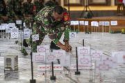 Prajurit TNI AD memeragakan pergerakan pasukan dan kendaraan tempur saat kegiatan Tactical Floor Game (TFG) Latihan Antar Kecabangan TNI AD Kartika Yudha Tahun 2020 di Pusat Latihan Tempur (Puslatpur) TNI AD Martapura, Ogan Komering Ulu Timur (OKU Timur), Sumatera Selatan, Rabu (25/11/2020). Dalam TFG tersebut dipaparkan uji rencana puncak latihan yang akan dihadiri Kepala Staf Angkatan Darat (KSAD) Jenderal TNI Andika Perkasa pada Kamis (26/11). ANTARA FOTO/Nova Wahyudi/wsj.