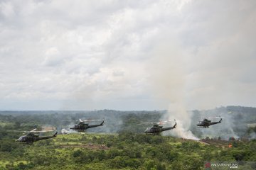 Helikopter Bell 412 TNI AD melakukan manuver saat puncak Latihan Antar Kecabangan TNI AD Kartika Yudha Tahun 2020 di Pusat Latihan Tempur (Puslatpur) TNI AD Baturaja Timur, Ogan Komering Ulu (OKU), Sumatera Selatan, Kamis (26/11/2020). ANTARA FOTO/Nova Wahyudi/wsj.