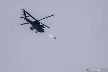 Helikopter Apache melancarkan serangan ke arah daerah musuh saat puncak Latihan Antar Kecabangan TNI AD Kartika Yudha Tahun 2020 di Pusat Latihan Tempur (Puslatpur) TNI AD Baturaja Timur, Ogan Komering Ulu (OKU), Sumatera Selatan, Kamis (26/11/2020). ANTARA FOTO/Nova Wahyudi/wsj.