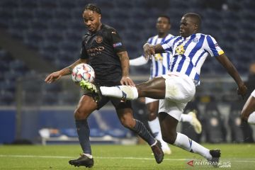 Pesepak bola Manchester City Raheem Sterling (kiri) berebut bola dengan pesepak bola FC Porto Malang Sarr (kanan) dalam laga Group C Liga Champions, di Estadio do Dragao, Porto, Portugal, Selasa (1/12/2020). Pertandingan ini berakhir umbang tanpa gol 0-0. ANTARA FOTO/Pool via Reuters--Miguel Riopa/hp.