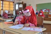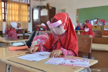 Sejumlah murid mengenakan masker dan pelindung wajah saat proses belajar mengajar di salah satu Sekolah Dasar Negeri, Desa Garut, Kecamatan Darul Imara, Kabupaten Aceh Besar, Aceh, Selasa (2/12/2020). Pemerintah Aceh meluncurkan Gerakan Masker Sekolah (Gemas) dengan menyasar sebanyak 1,08 juta pelajar dari 6.783 sekolah di Aceh dengan melibatkan 117.712 guru untuk memastikan penerapan protokol kesehatan dengan benar di sekolah guna mencegah penyebaran COVID-19 menjelang pemberlakukan belajar tatap muka secara normal. ANTARA FOTO/Ampelsa/hp.