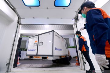 Karyawan memindahkan vaksin COVID-19 setibanya di Kantor Pusat Bio Farma, Bandung, Jawa Barat, Senin (7/12/2020). Vaksin COVID-19 produksi perusahaan farmasi Sinovac, China tersebut disimpan dalam ruangan pendingin dengan suhu 2-8 derajat celcius, yang selanjutnya akan dilakukan pengambilan sampel untuk pengujian mutu oleh tim dari Badan Pengawas Obat dan Makanan (BPOM) dan Bio Farma. ANTARA FOTO/Setpres-Muchlis Jr/wsj.