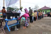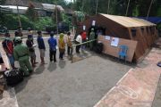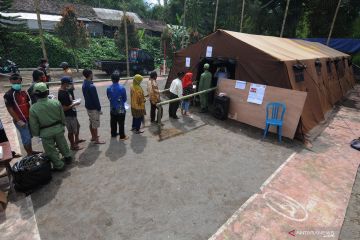 Sejumlah warga antre saat akan menggunakan hak pilihnya pada Pilkada Kabupaten Boyolali 2020 di tempat pengungsian sementara Gunung Merapi, Tlogolele, Selo, Jawa Tengah, Rabu (9/12/2020). ANTARA FOTO/Aloysius Jarot Nugroho/hp.