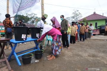 Sejumlah warga antre mencuci tangan saat akan mengunakan hak pilihnya pada Pilkada Kabupaten Boyolali 2020 di tempat pengungsian sementara Gunung Merapi, Tlogolele, Selo, Jawa Tengah, Rabu (9/12/2020). ANTARA FOTO/Aloysius Jarot Nugroho/hp.
