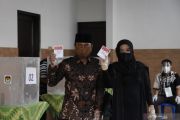 Calon Wali Kota Solo nomor urut dua Bagyo Wahyono (kiri) dan istrinya Agustini Pribadi Ningsih (kanan) menunjukkan surat suara saat menggunakan hak pilih di TPS 8, Penumping, Solo, Jawa Tengah, Rabu (9/12/2020). Pasangan calon Wali Kota dan Wakil Wali Kota Solo jalur perseorangan atau non partai Bagyo Wahono dan FX Supardjo bersaing dalam merebut suara dengan pasangan Gibran Rakabuming Raka-Teguh Prakosa pada Pilkada Kota Solo 2020. ANTARA FOTO/Maulana Surya/hp.