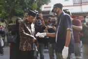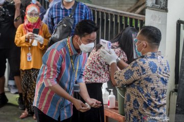 Petugas KPPS mengukur suhu tubuh Calon Wali Kota Solo nomer urut satu Gibran Rakabuming Raka saat tiba di TPS untuk menggunakan hak pilihnya pada Pilkada serentak 2020 di TPS 22, Manahan, Solo, Jawa Tengah, Rabu (9/12/2020). Pemilihan Wali Kota Solo pada Pilkada serentak 2020, PDI Perjuangan mengusung Gibran Rakabuming Raka berpasangan dengan Teguh Prakosa yang bersaing dengan pasangan Bagyo Wahyono dan FX. Suparjo (Bajo) yang maju melalui jalur non partai (independen). ANTARA FOTO/Mohammad Ayudha/hp.