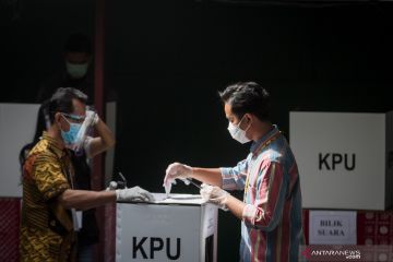 Calon Wali Kota Solo nomer urut satu Gibran Rakabuming Raka (kanan) menggunakan hak pilihnya pada Pilkada serentak 2020 di TPS 22, Manahan, Solo, Jawa Tengah, Rabu (9/12/2020). Pemilihan Wali Kota Solo pada Pilkada serentak 2020, PDI Perjuangan mengusung Gibran Rakabuming Raka berpasangan dengan Teguh Prakosa yang bersaing dengan pasangan Bagyo Wahyono dan FX. Suparjo (Bajo) yang maju melalui jalur non partai (independen). ANTARA FOTO/Mohammad Ayudha/hp.