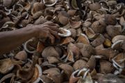 Seorang petani menyusun kelapa untuk proses pengasapan saat membuat kopra di Desa Tulo, Kabupaten Sigi, Sulawesi Tengah, Minggu (13/12/2020). Harga kopra di tingkat petani kembali turun Rp2.500 menjadi Rp1.100 per kilogram. ANTARA FOTO/Basri Marzuki/wsj.