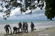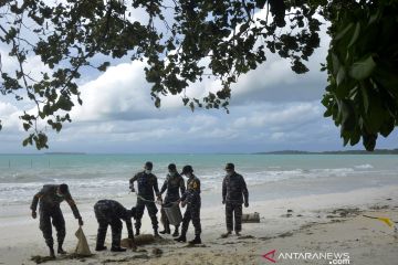 Taruna-Taruni AAL tingkat III angkatan ke-67 membersihkan pantai di lokasi wisata Pantai Pasir Panjang, Tual, Maluku, Rabu (16/12/2020). Membersihkan pantai tersebut merupakan bagian kegiatan dari latihan praktek Kartika Jala Krida (KJK) 2020 yang didukung Satgas operasi Bima Suci 2020 selama berada di Tual. ANTARA FOTO/Abriawan Abhe/rwa.