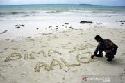 Taruna AAL tingkat III angkatan ke-67 menulis di atas pasir saat akan membersihkan pantai di lokasi wisata Pantai Pasir Panjang, Tual, Maluku, Rabu (16/12/2020). Membersihkan pantai tersebut merupakan bagian kegiatan dari latihan praktek Kartika Jala Krida (KJK) 2020 yang didukung Satgas operasi Bima Suci 2020 selama berada di Tual. ANTARA FOTO/Abriawan Abhe/rwa.