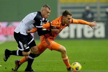 Pesepak bola Juventus Aaron Ramsey (kanan) berebut bola dengan pesepak bola Parma Simone Iacoponi (kiri) dalam laga pekan ke-13 Liga Italia, di Stadion Ennio Tardini, Parma, Italia, Sabtu (19/12/2020). Juventus berhasil megalahkan Parma 4-0 dan Ronaldo menyumbang dua gol dalam pertandingan ini. ANTARA FOTO/Reuters-Jennifer Lorenzini/hp.