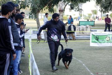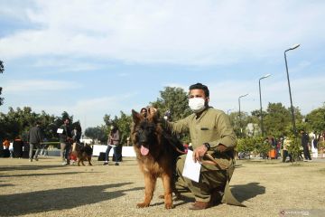 Seorang pria ambil bagian dalam acara All Breed Dog Show dengan anjingnya di Rawalpindi, Provinsi Punjab, Pakistan, Minggu (20/12/2020). All Breed Dog Show diadakan pada Minggu (20/12) dan menarik banyak peserta untuk memamerkan anjing mereka. ANTARA FOTO/Xinhua-Ahmad Kamal/hp.