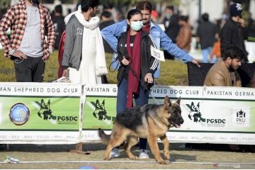Seekor anjing terlihat dalam acara All Breed Dog Show di Rawalpindi, Provinsi Punjab, Pakistan, Minggu (20/12/2020). All Breed Dog Show diadakan pada Minggu (20/12) dan menarik banyak peserta untuk memamerkan anjing mereka. ANTARA FOTO/Xinhua-Ahmad Kamal/hp.