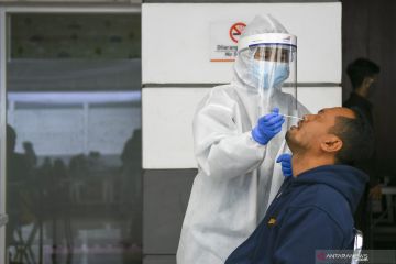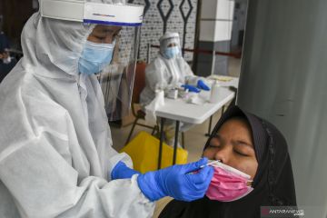 Petugas medis melakukan rapid tes antigen COVID-19 kepada calon penumpang Kereta Api (KA) di Stasiun Pasar Senen, Jakarta, Senin (21/12/2020).PT Kereta Api Indonesia (KAI) Persero jelang Natal dan Tahun Baru 2021 menerapkan protokol kesehatan ketat moda transportasi KA, mulai 22 Desember 2020 sampai 8 Januari 2021, yakni penumpang KA jarak jauh di Pulau Jawa diharuskan untuk menunjukkan hasil rapid test antigen atau tes PCR yang negatif sebagai syarat perjalanan naik kereta api. ANTARA FOTO/Galih Pradipta/hp.