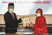 Menteri Sosial Tri Rismaharini menyampaikan sambutannya pada acara serah terima jabatan Menteri Sosial di Kantor Kementerian Sosial, Jakarta, Rabu (23/12/2020). Tri Rismaharini resmi berkantor di Kementerian Sosial menjadi Menteri Sosial menggantikan Juliari Batubara yang tersandung kasus korupsi dana Bantuan Sosial (Bansos). ANTARA FOTO/Galih Pradipta/wsj.