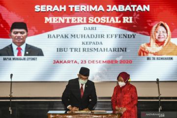Menko Pembangunan Manusia dan Kebudayaan yang juga pejabat lama Menteri Sosial Ad Interim Muhajir Effendi (kiri) menyerahkan Memori Jabatan Kementerian Sosial kepada Menteri Sosial Tri Rismaharini (kanan) dalam acara serah terima jabatan di Kantor Kementerian Sosial, Jakarta, Rabu (23/12/2020). Tri Rismaharini resmi berkantor di Kementerian Sosial menjadi Menteri Sosial menggantikan Juliari Batubara yang tersandung kasus korupsi dana Bantuan Sosial (Bansos). ANTARA FOTO/Galih Pradipta/wsj.